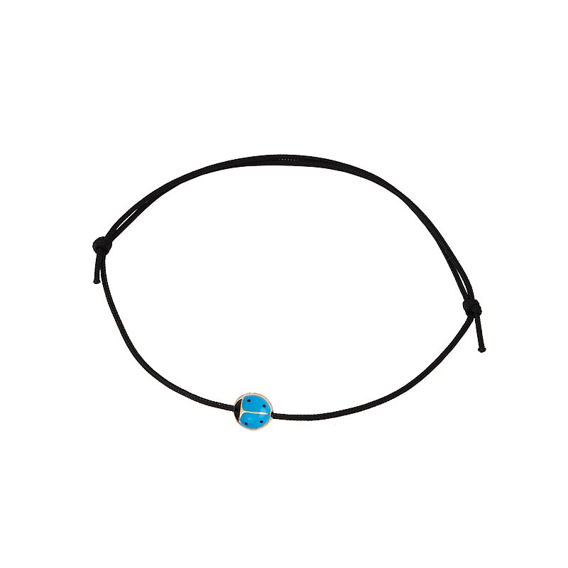 Italian 14kt gold ladybug bracelet features a blue ladybug, symbolizing peace, on the adjustable black...