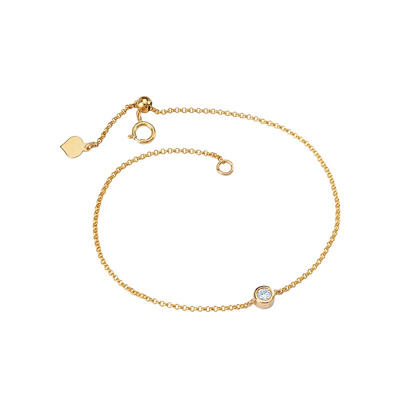 Sparkling round diamond bezel set in a 14kt yellow gold bracelet. 1.1mm rollo chain with...