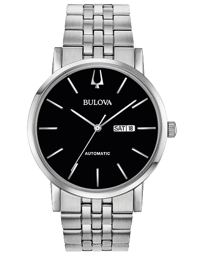 Bulova watch. American Clipper in stainless steel case and bracelet. Mineral crystal. 42mm case. Black...