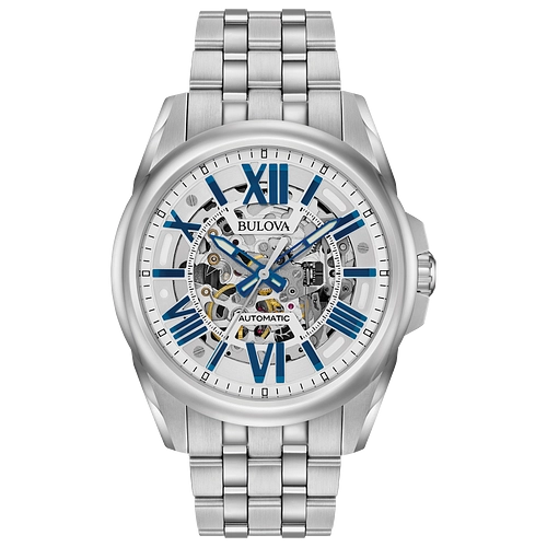Bulova watch. Sutton in stainless steel case and bracelet. Mineral crystal. 43mm case. Skeleton dial...