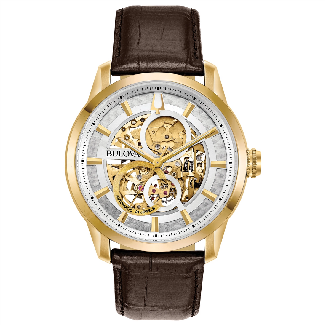 Bulova watch. Sutton collection. 43mm case diameter. Gold-tone stainless steel case. Mineral crystal. Exhibition skeleton...