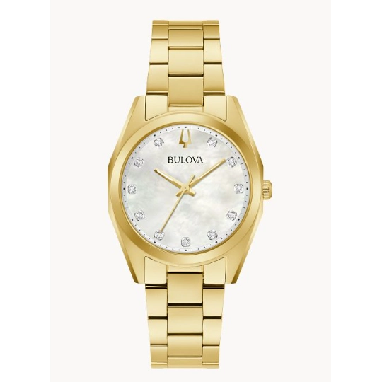 Bulova watch. Surveyor. 31mm case diameter. Gold-tone stainless steel case and bracelet. Synthetic sapphire crystal....
