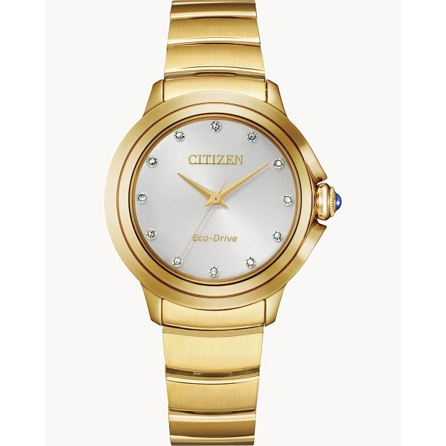 Citizen watch. Ceci in gold-tone stainless steel case and bracelet. Spherical sapphire crystal. 32mm case....