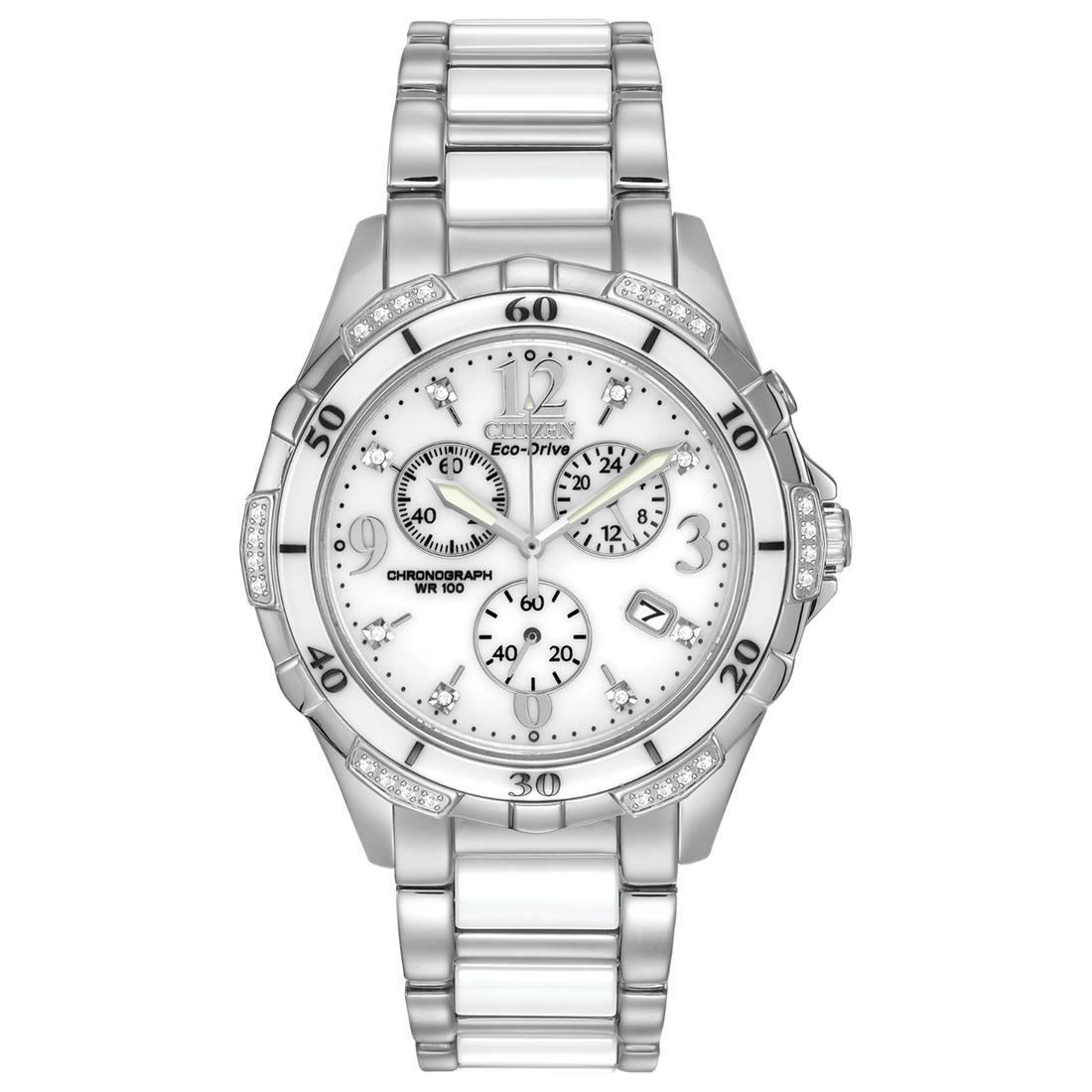 Citizen watch. Silhouette Diamond Sport in stainless steel and white ceramic case and bracelet. Mineral...
