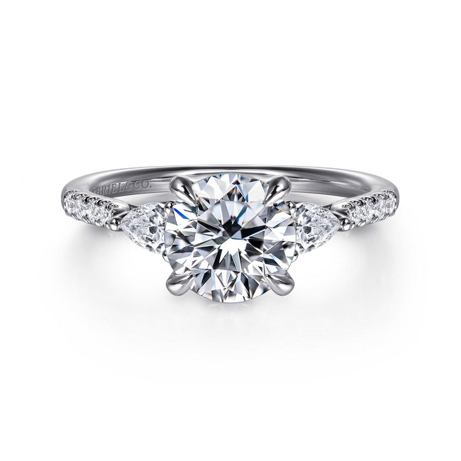 14K White Gold Round Three Stone Lotus Diamond Engagement Ring