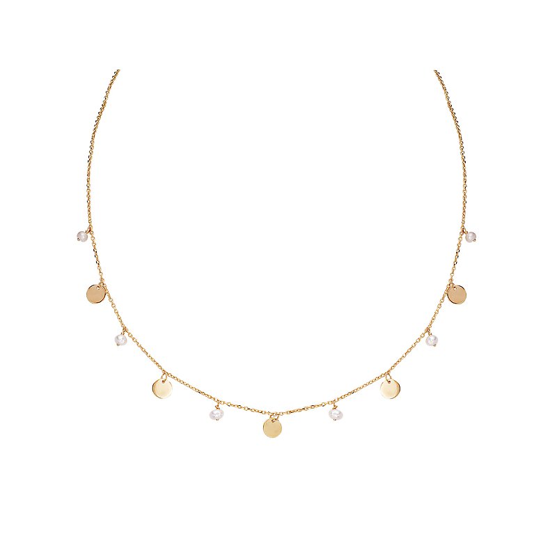 Italian 14kt yellow gold necklace features 11 stations, alternating dangling gold discs with freshwater pearls....