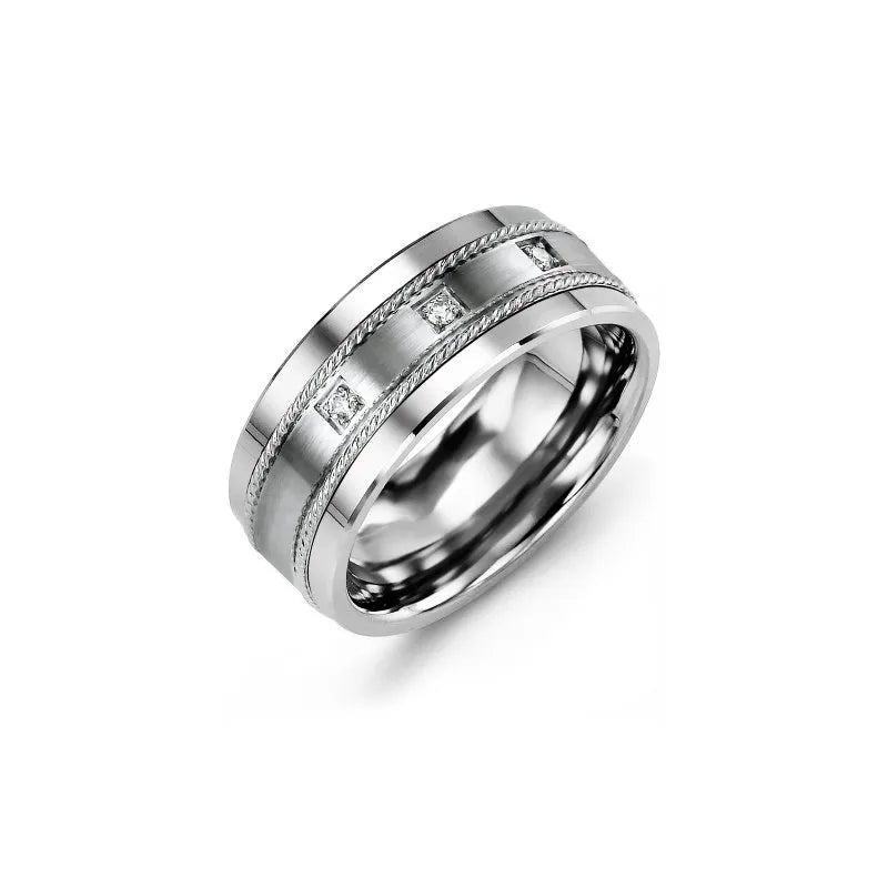 This 7mm Carved Line Pattern Diamond Wedding Ring features a striking combination of polished tungsten...