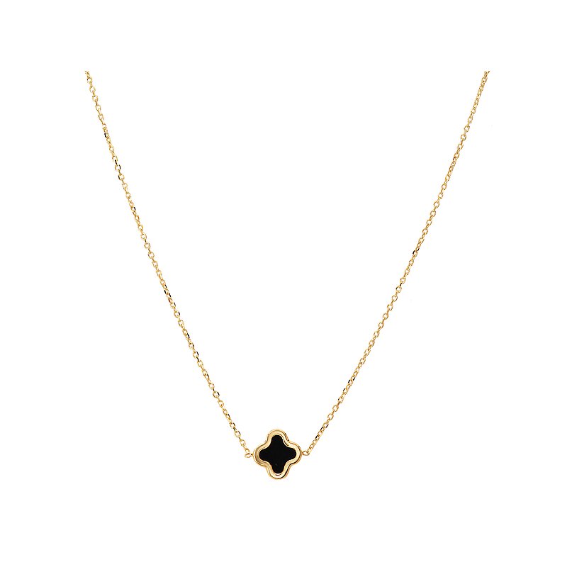 A clover shape pendant with bezel set black onyx adorns this stunning 14kt gold Italian...