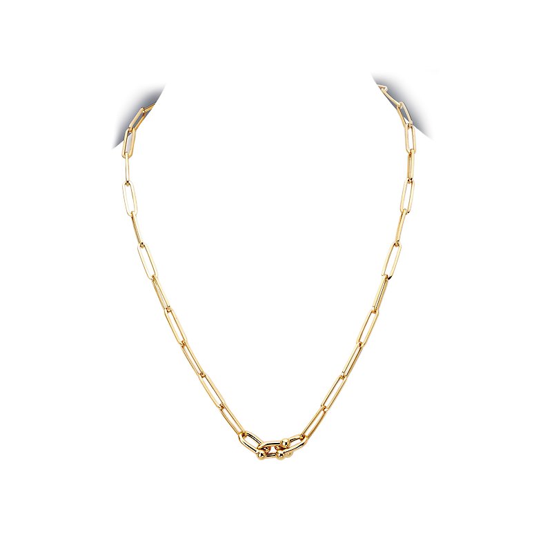 14kt yellow gold hollow paperclip necklace with U link accent. Adjustable 18, 14.8 x 7mm.