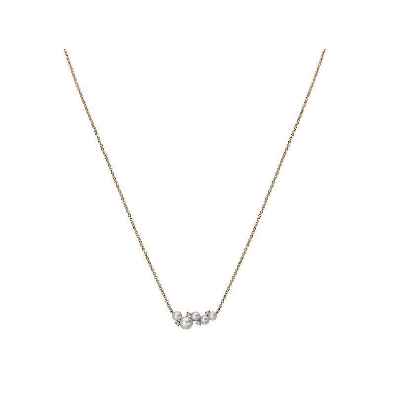 14kt yellow gold necklace features a freshwater pearl under a trio of round diamonds. Adjustable...