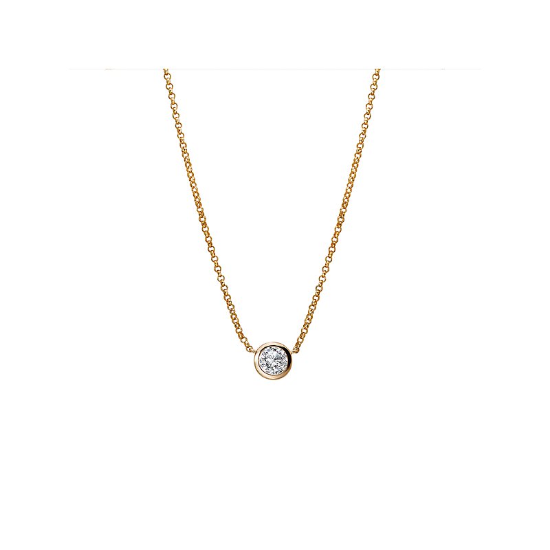 Sparkling round diamond bezel set in a 14kt yellow gold pendant that hangs from a 1.1mm rollo chain with a silicon lined slider bead to adjust length up to 18 inches. (D 1/10 carat total weight)