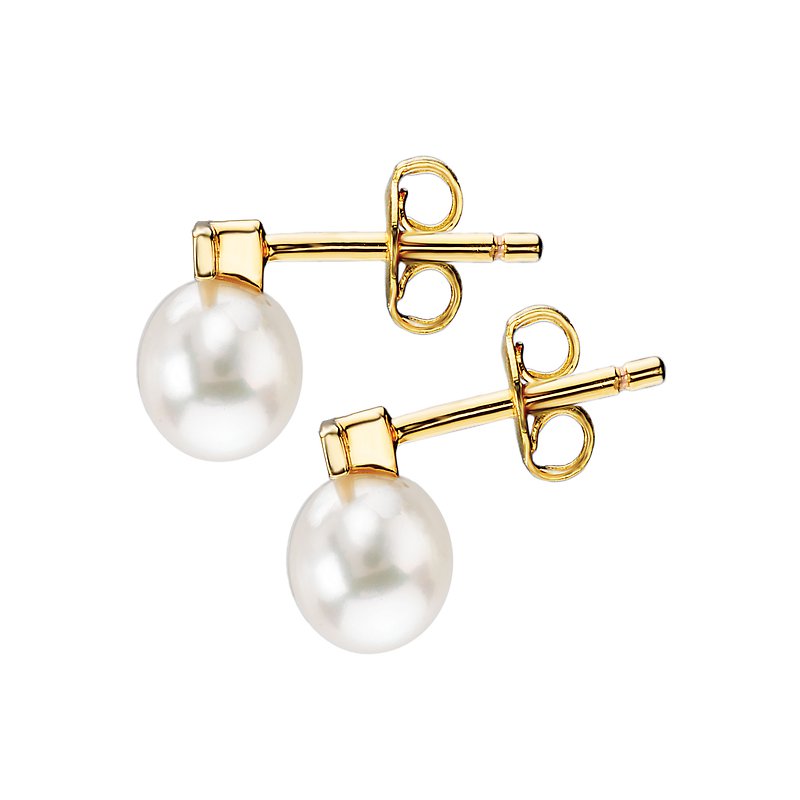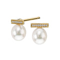 Earrings with lustrous freshwater pearl studs adorned with a bar of round diamonds all crafted in 14kt yellow gold. Post back. (D .03 carat total weight, FP 6.0-6.5mm)