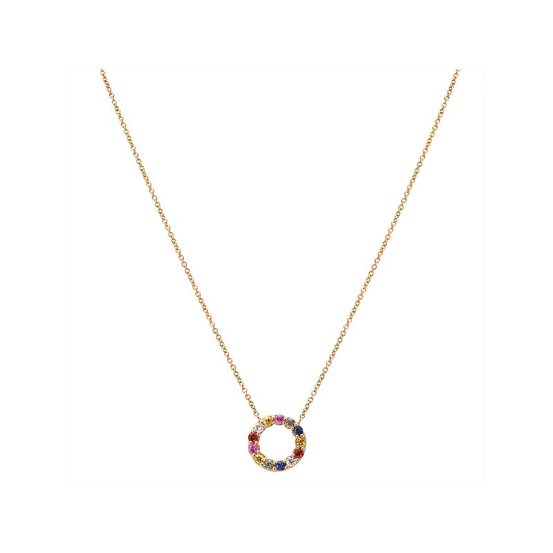14kt yellow gold necklace with a circle pendant lined with round diamonds, sapphire and multicolored stones. 1/3ctw gemstones. Adjustable 16 to 18 inches.