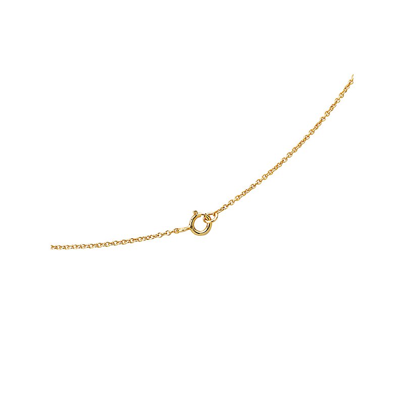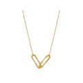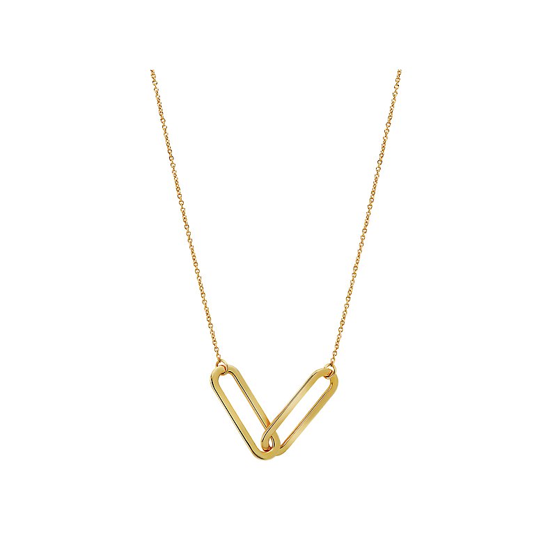 14kt yellow gold necklace features 2 paperclip shaped links looped together, hanging from rollo chain that adjusts from 16 to 18 inches and secured with a spring ring.