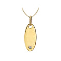 14kt yellow gold necklace features a high polish oval pendant accented with a single diamond on an adjustable 16 to 18 inch rollo chain. .02ctw.