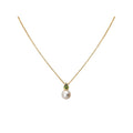 This pendant has a freshwater pearl under a bezel set pear-shaped peridot that adorns the adjustable 16 to18 inch rollo chain. (PD 5x3, FWP 7-7.5mm)