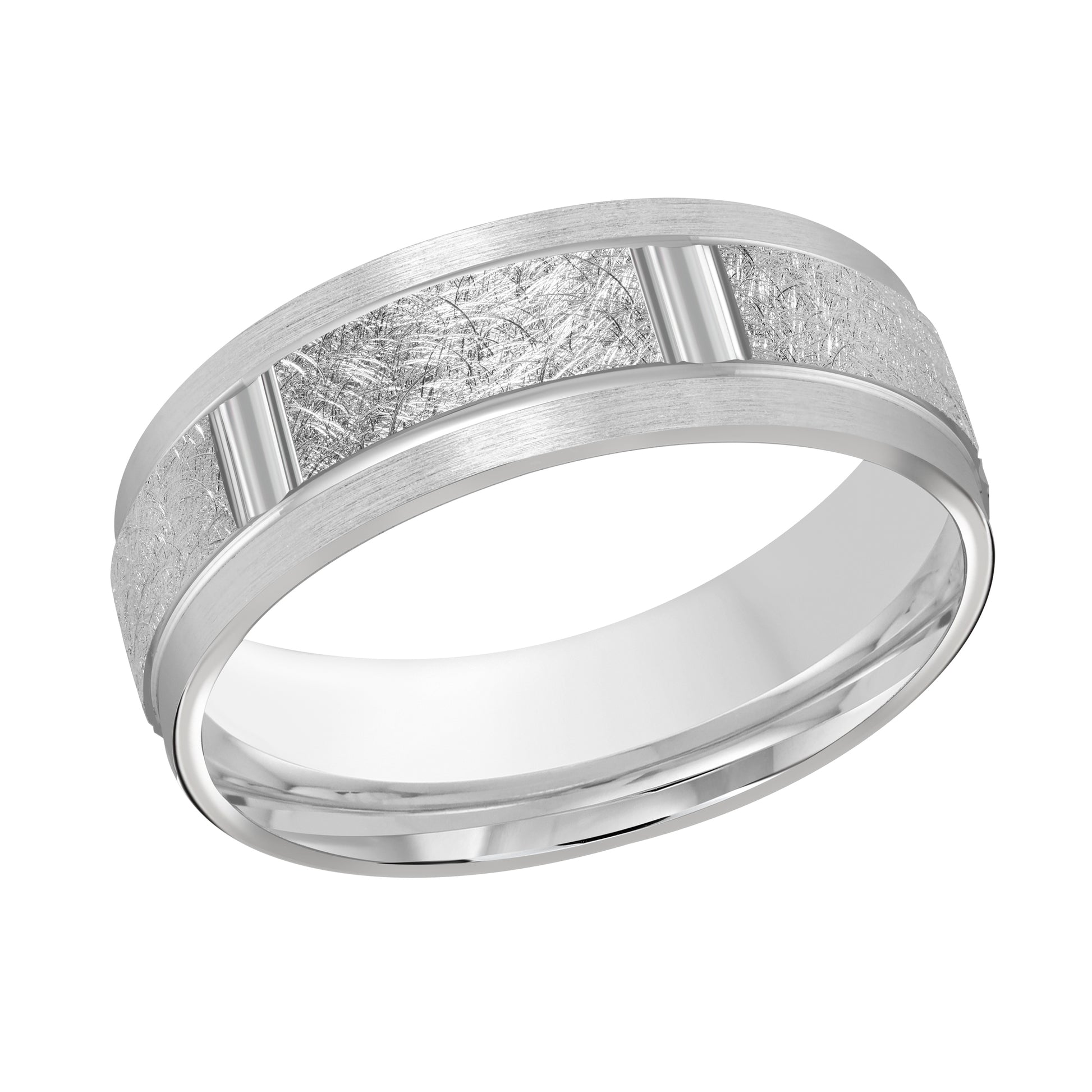 This elegant 7mm white gold wedding ring features an elevated scratch center with multiple high polish rectangular carved motifs all around its surface and is finished off with high polish edges.