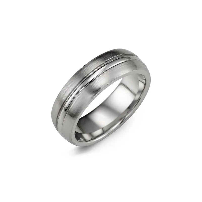 This 7mm men's ring, made from cobalt, is the ultimate in stylish and sturdy jewelery. For the men who like a chunky and sturdy ring, that is also current and clean-cut. The majority of the ring is brushed cobalt, with a polished band around the middle.You will never want to take it off; making it the perfect wedding ring.