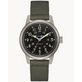Bulova watch. Hack VWI Special Edition in stainless steel case. Mineral crystal. 38mm case. Black arabic dial. Green nylon strap. Automatic movement.