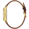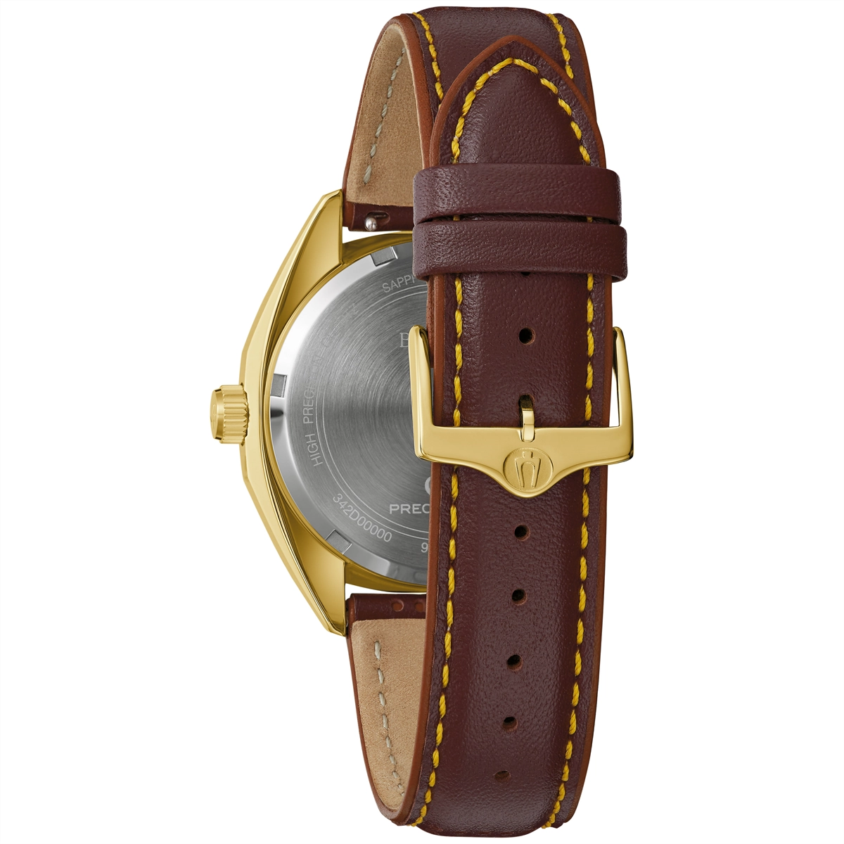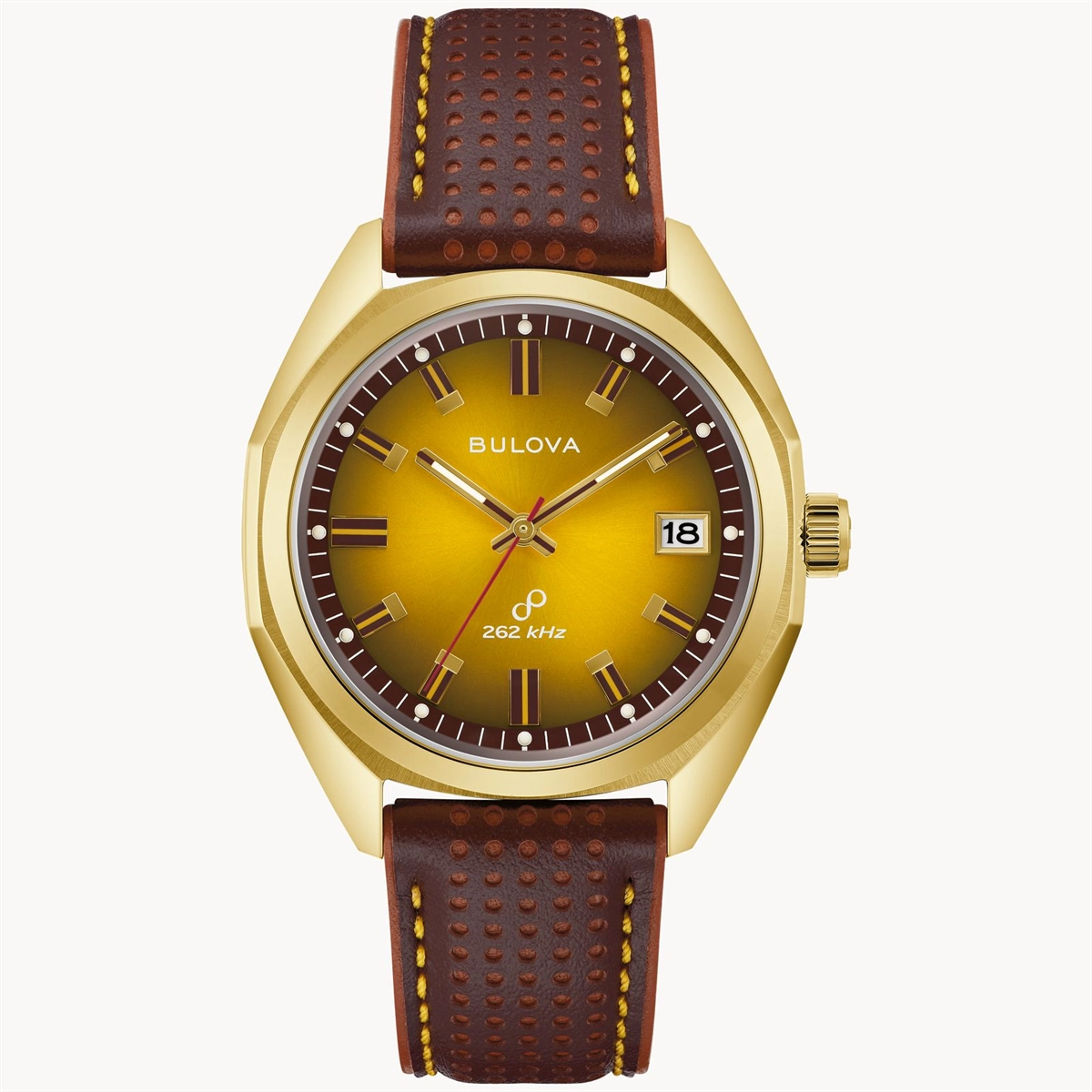 Bulova watch. Jet Star collection. 40mm case diameter. Gold-tone stainless steel case. Synthetic sapphire crystal. Gold colored dial. Quartz movement. Brown leather strap. Date.