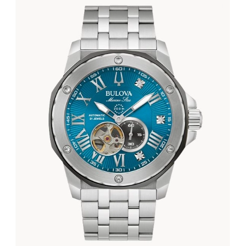 Bulova Marine Star watch. Mark Anthony series. 45mm case diameter. Stainless steel case and bracelet. Mineral crystal. Blue dial with diamond accents. Small seconds subdial. Automatic movement. Exhibition case back.