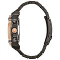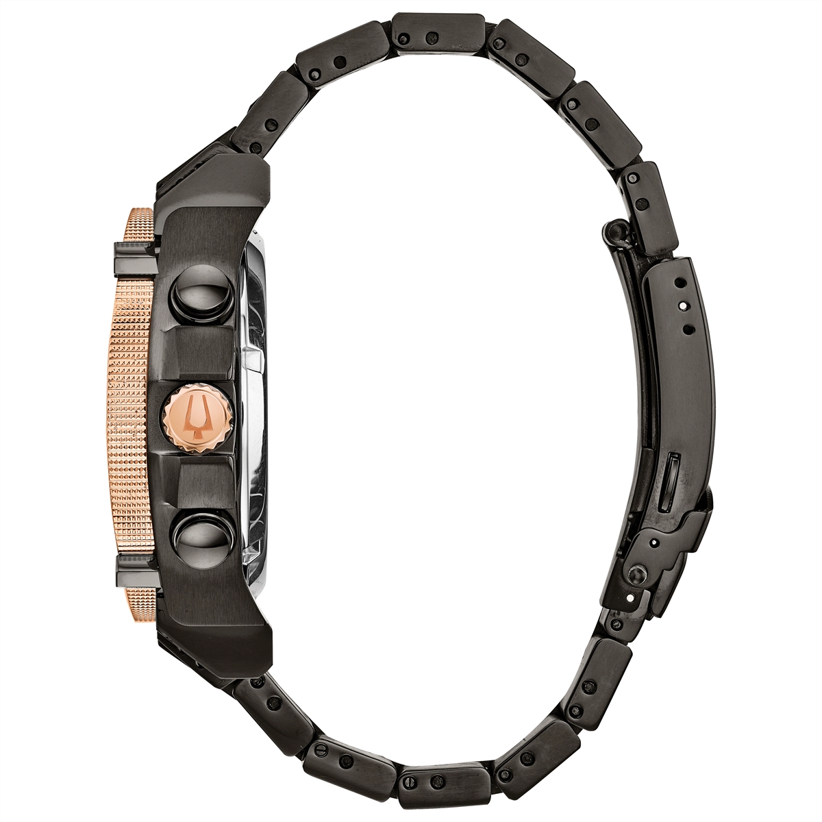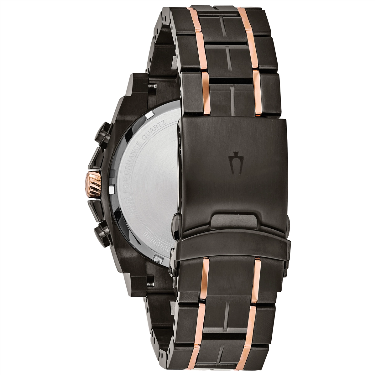 Bulova watch. Precisionist in black and rose gold-tone stainless steel case and bracelet. Mineral crystal. Black dial with 11 diamonds. High Performance Quartz movement. Date.