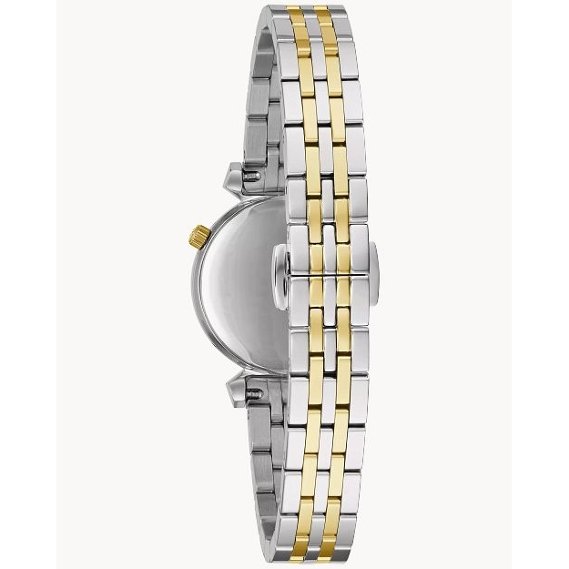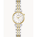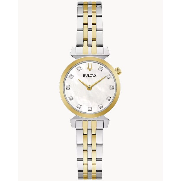 Bulova watch. Regatta Classic in two-tone stainless steel case and bracelet. Synthetic sapphire crystal. 24mm case. White mother-of-pearl dial with 11 diamonds. Quartz movement. Caliber 9T22.