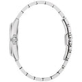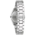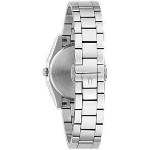Bulova watch. Surveyor collection. 31mm case diameter. Stainless steel case and bracelet. Mineral crystal. Blue dial. Diamond dial markers. Quartz movement.
