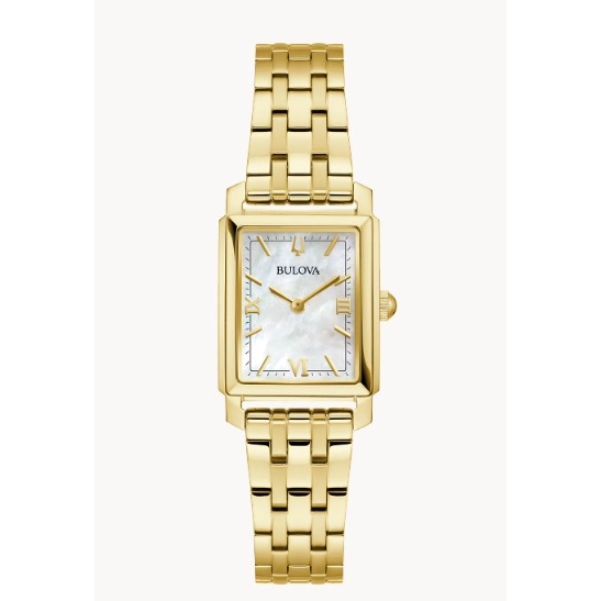 Bulova watch. Sutton. 21mm case diameter. Gold-tone stainless steel case and bracelet. Mineral crystal. White mother of pearl dial. Quartz movement.