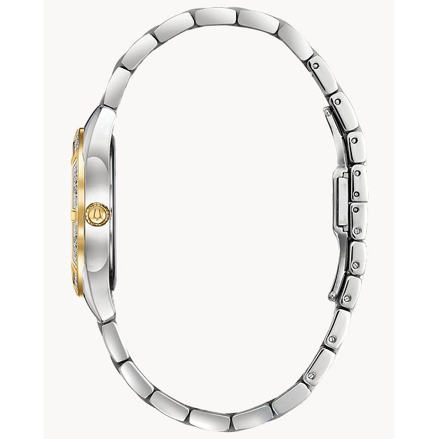 Bulova watch. Sutton Classic in two-tone stainless steel case and bracelet. Synthetic sapphire crystal. 32.5mm case. White mother-of-pearl dial with three diamonds. Diamond bezel. Quartz movement.