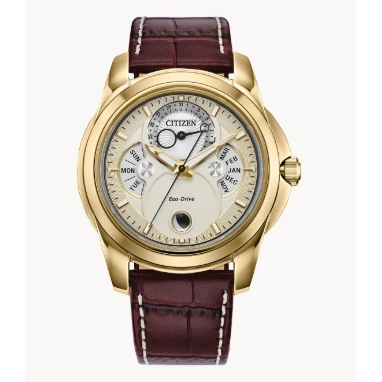 Citizen watch. Calendrier. 41.8mm case diameter in gold-tone stainless steel. Synthetic sapphire crystal. Gold-tone dial. Eco-Drive. Date, day, month. Moonphase indicator. Brown leather strap.