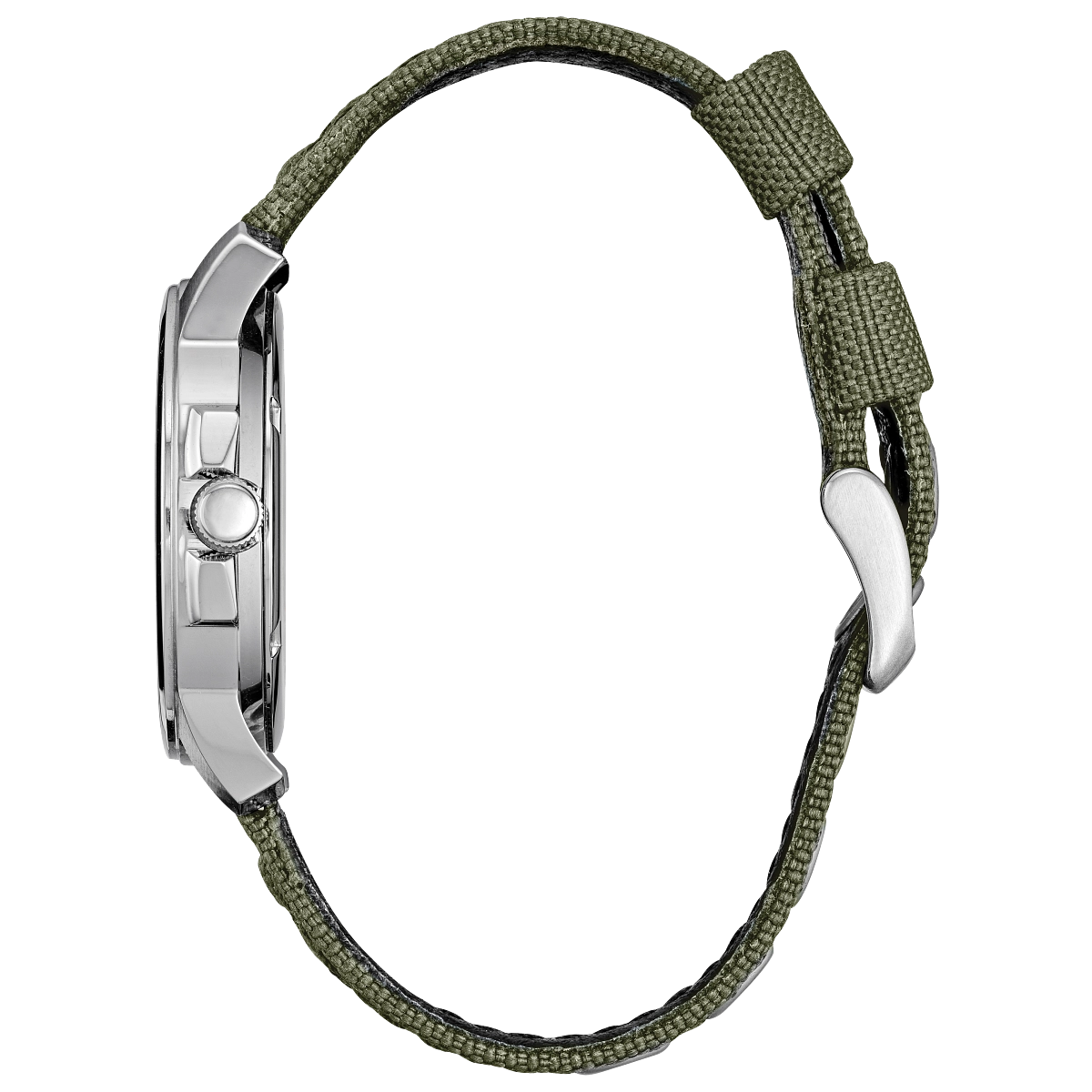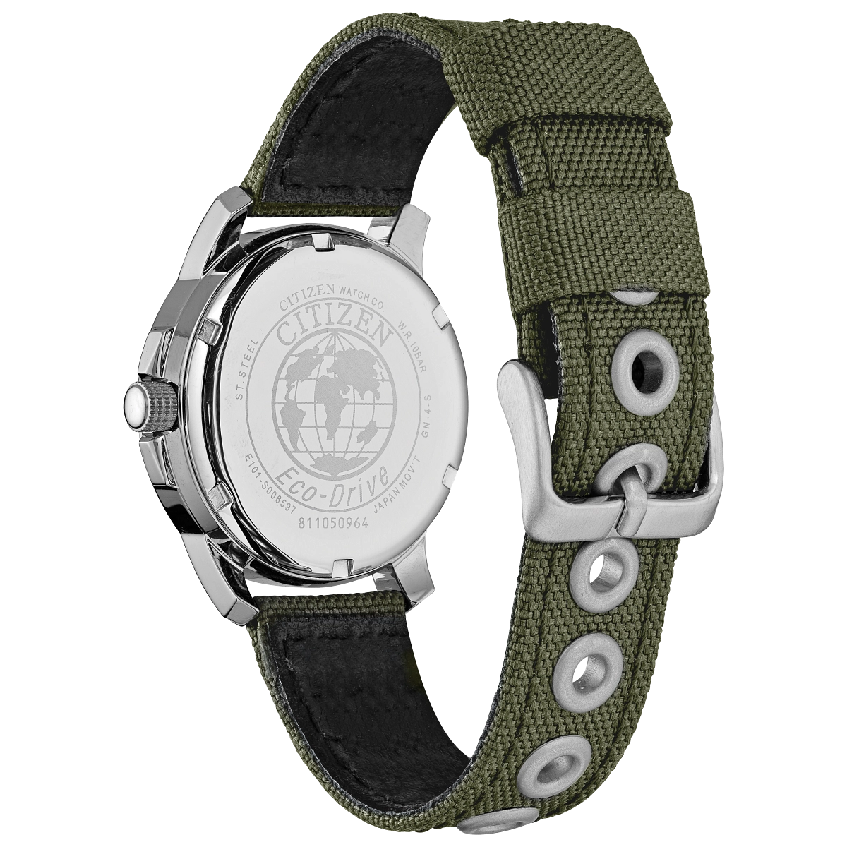 Citizen watch. Chandler in stainless steel case. Mineral crystal. 37mm case. Black arabic dial. Green nylon strap. Day. Date. Eco-Drive.