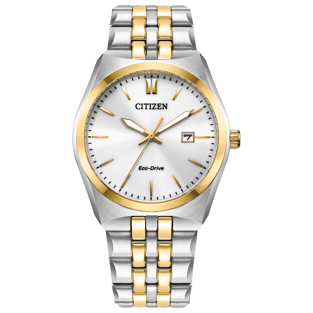 Citizen watch. Corso in two-tone stainless steel case and bracelet. Mineral crystal. 40mm case. White dial. Eco-Drive. Date.