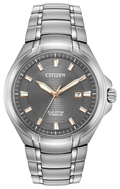 Citizen watch. Paradigm in titanium case and bracelet. Synthetic sapphire crystal. 43mm case. Classic gray dial. Eco-Drive. Date.