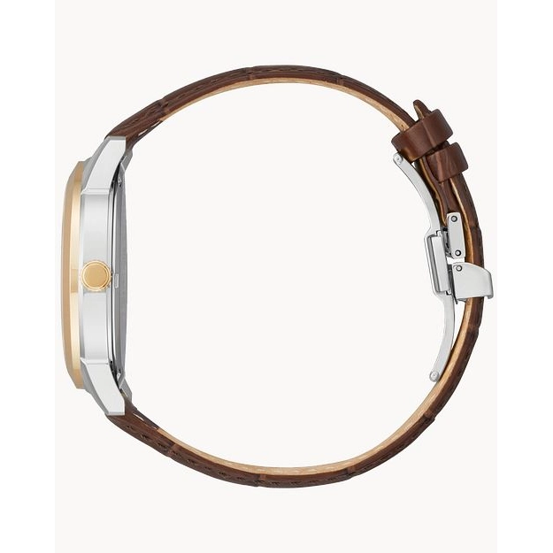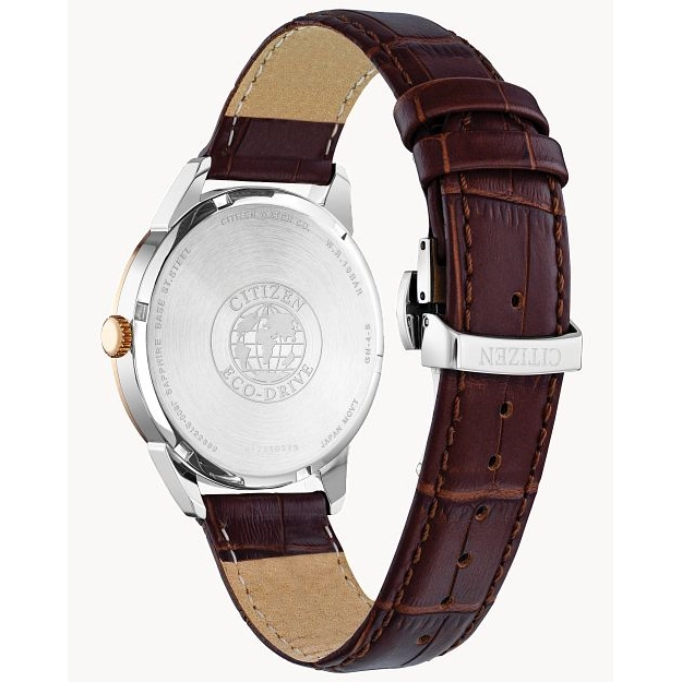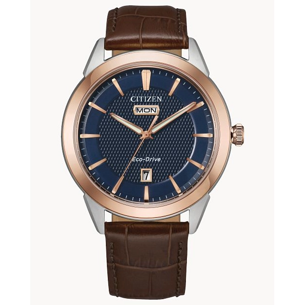 Citizen watch. Rolan in stainless steel case with rose-tone bezel. Synthetic sapphire crystal. 40mm case. Blue dial. Smooth bezel. Brown leather alligator-grain strap. Eco-Drive. Day. Date.