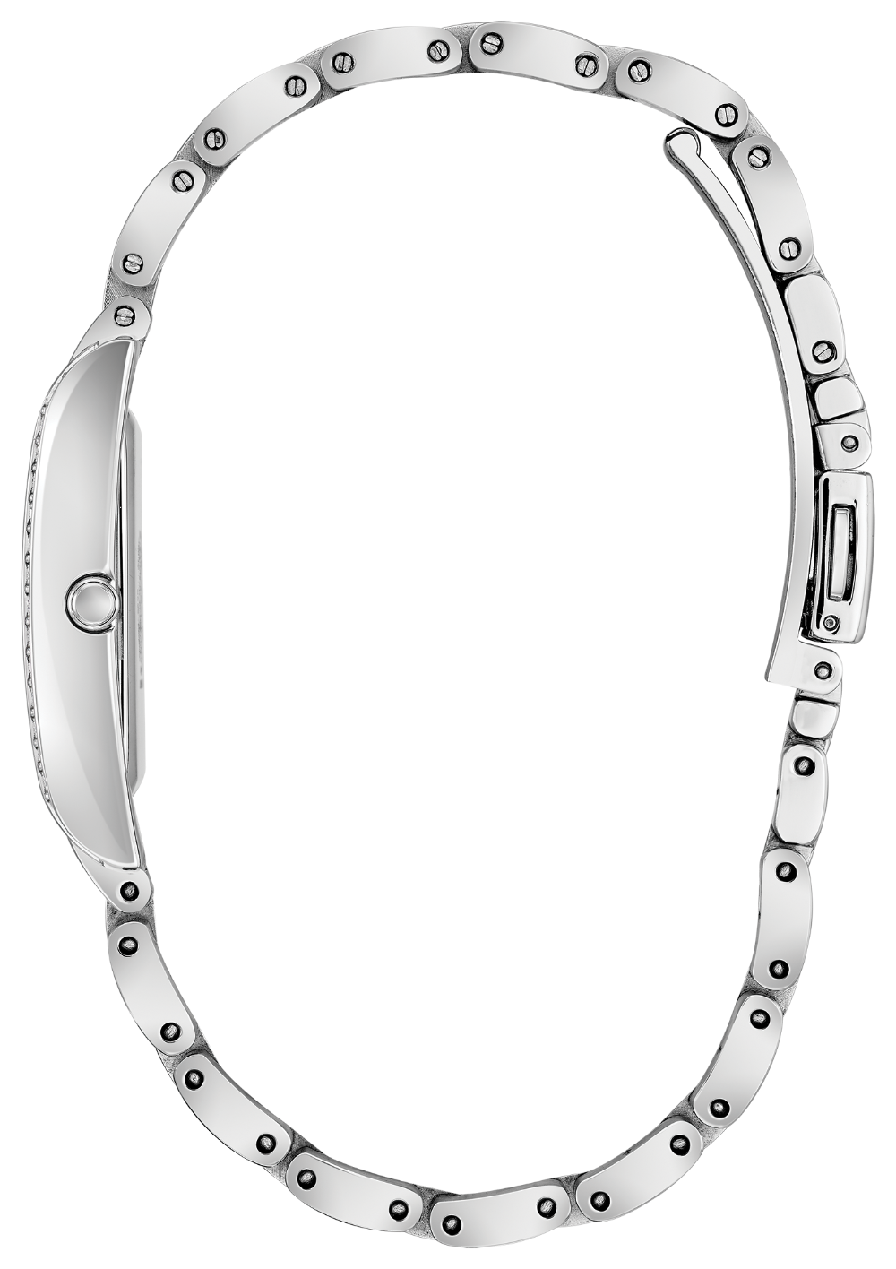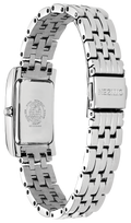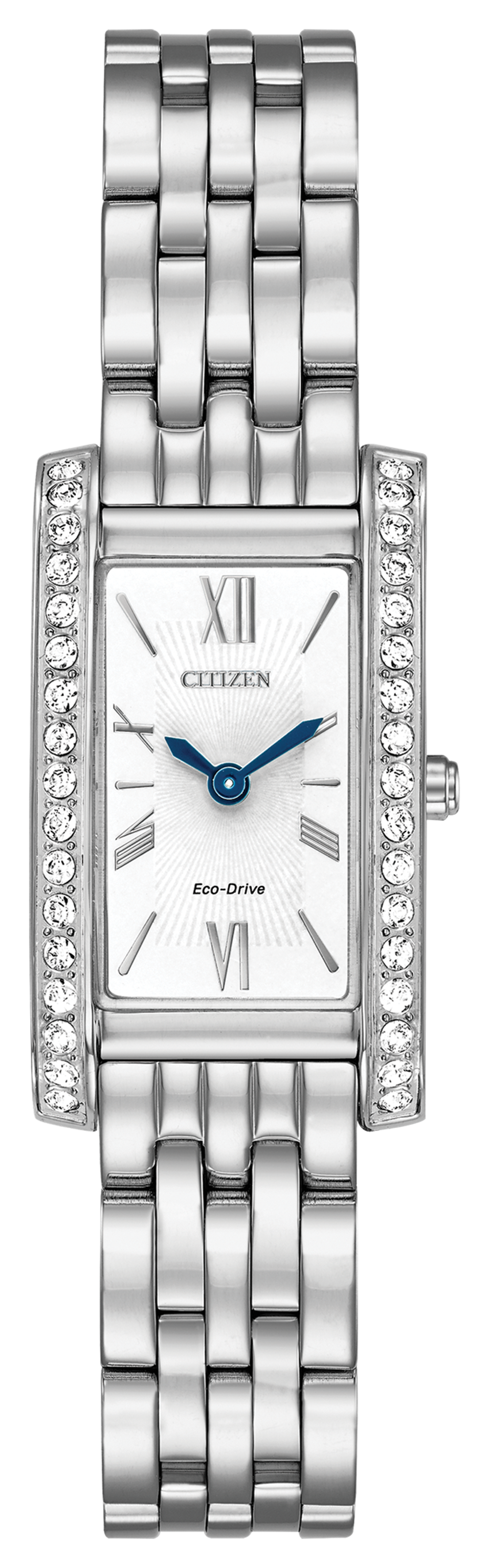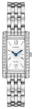 Citizen watch. Silhoutte Crystal in stainless steel case and bracelet. Mineral crystal. 18x32mm case. White dial. Swarovski crystals on bezel. White dial. Eco-Drive.