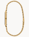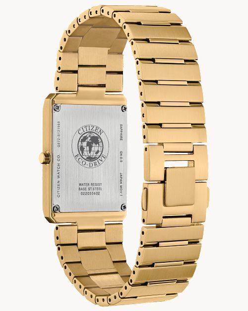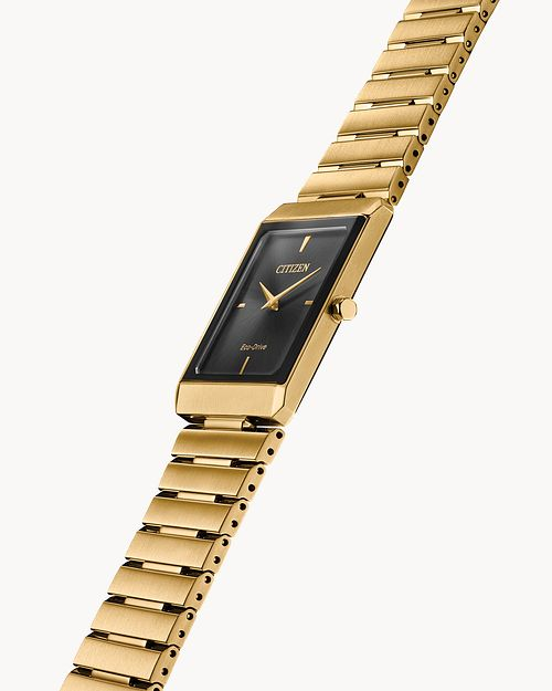 Citizen watch. Stiletto in gold-plated stainless steel case and bracelet. Synthetic sapphire crystal. 28mm case. Black dial. Eco-Drive.