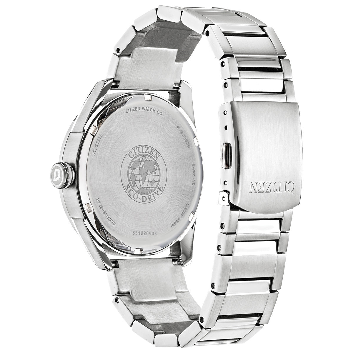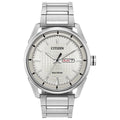 Citizen watch. Weekender. Eco-Drive. 42mm case diameter. Stainless steel case and bracelet. Mineral crystal. Silver dial. Day and date.