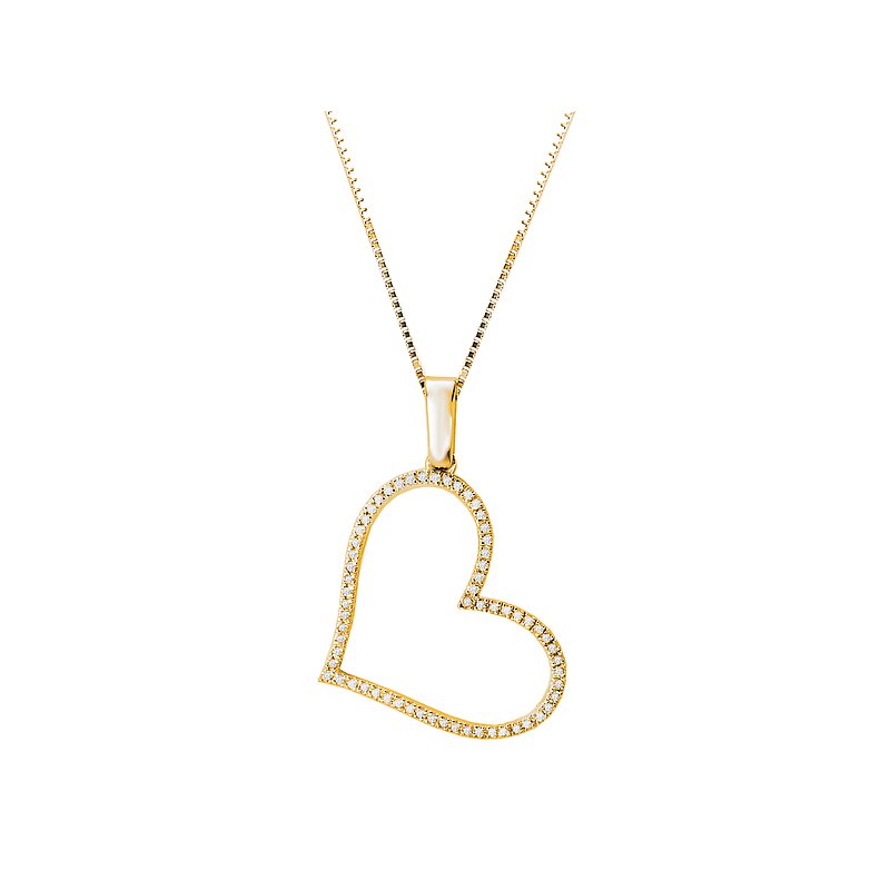 This tilted heart 19x15.3mm pendant is created with round sparkling diamonds set in 14k yellow gold and includes the chain that is adjustable 16-18 in length. (D .09 carat total weight)