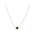 A clover shape pendant with bezel set black onyx adorns this stunning 14kt gold Italian necklace. Adjustable 16 to 18 inch length.