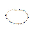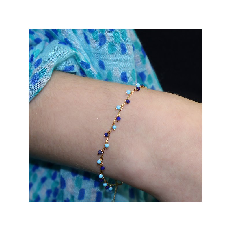 Italian 14kt gold chain bracelet features tiny dangling lapis and turquoise beads that create a fringed effect. Adjustable 6.5 to 7.5 inches.