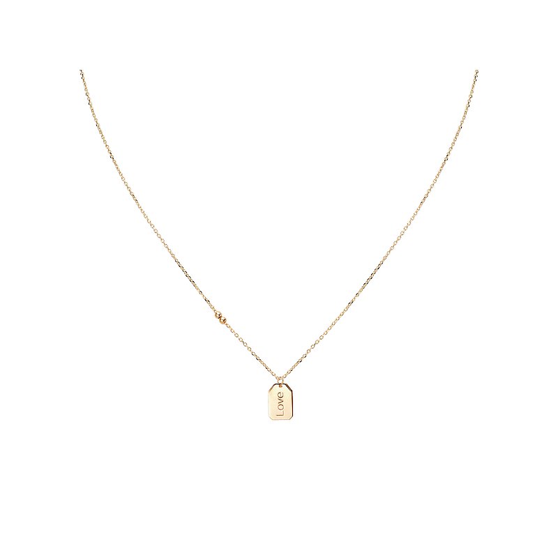Italian 14kt gold necklace features a mini dogtag with Love engraved. Adjustable 16 to 18 inches.