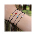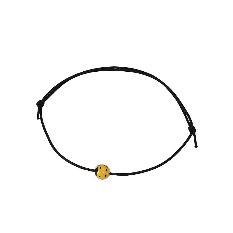 Italian 14kt yellow gold ladybug bracelet features a yellow lady bug, symbolizing happiness, on an adjustable black cord.