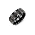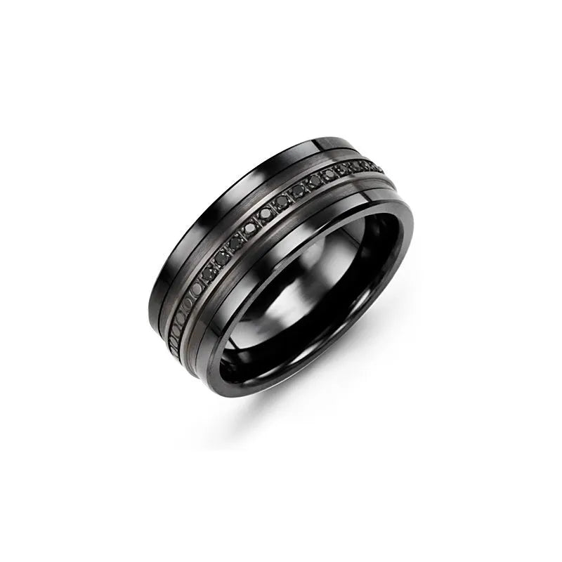 A dark and mysterious addition to your jewelry collection, this Men’s Monochromatic Black Gold Black Diamond Ring works elegantly alongside professional daywear and modern evening attire. Crafted from ceramic ring, tungsten ring, or cobalt ring, it features a black gold insert studded with black diamonds at the quantity of your choice. This engrave-able ring is available in various widths and diamond quantities to suit every taste.