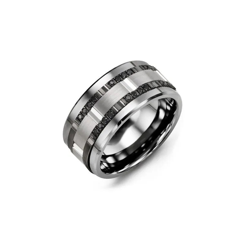 24 diamonds, set into over two black gold inserts, give this stunning men's ring a total carat weight of 0.24ct. The 11mm tungsten ring, cobalt ring, or ceramic band also features a white gold insert in the middle, to create a modern and contrasting style. This ring is available in 10kt, 14kt or 18kt options and can be engraved on the inside if you wish to personalize it.