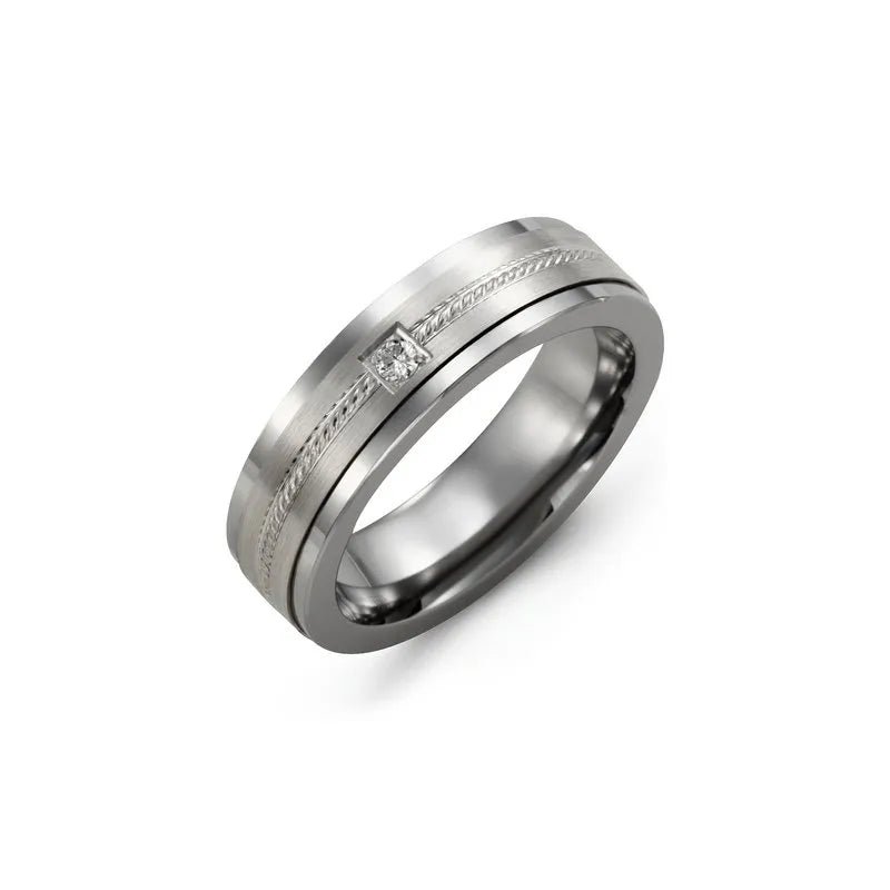 A classic wedding band with a contemporary twist, this 7mm Rope Design Diamond Wedding Band? for Men is a sophisticated piece of jewelry for stylish gents. Carefully crafted in polished tungsten ring, cobalt ring, or ceramic ring, it features a wheat engraved brushed gold insert and a single square set diamond with a total carat weight of 0.02ct. Various diamond, width and gold karat/color options are available - Engrave the inside with your special date!